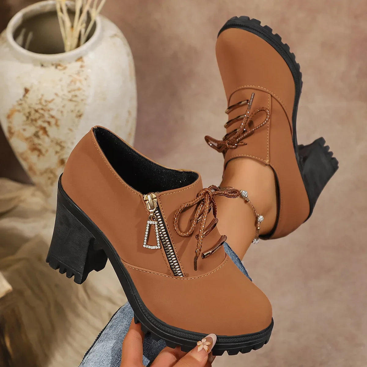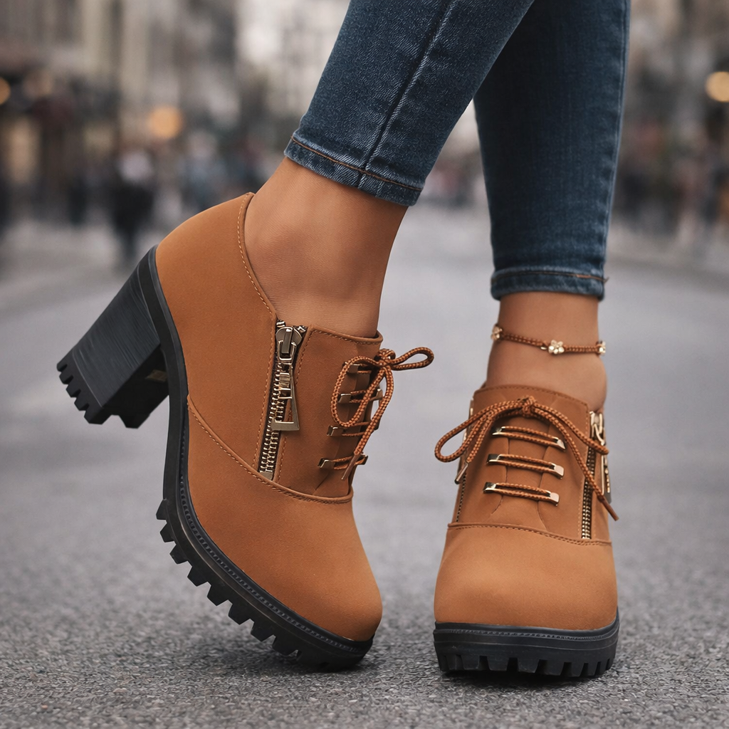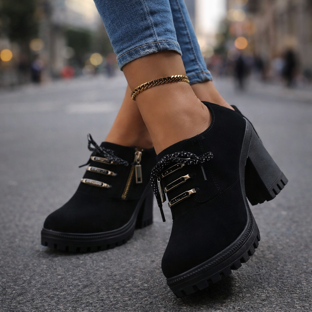 Feito de couro premium com uma palmilha ortopédica acolchoada e uma sola de bloco com absorção de choque, este design de salto com cadarço oferece suporte estável com elevação confiante. Finalizado com ilhoses de metal e um detalhe de zíper lateral, equilibra conforto prático com um visual polido, do dia a dia para a noite.